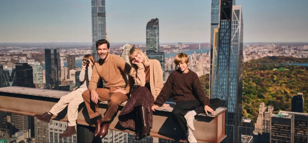 O The Beam é uma experiência inspirada na foto clássica “Lunch Atop a Skyscraper” (os operários sentados numa viga). Você senta “na viga” com cinto de segurança, e ela sobe/posiciona para uma foto com o skyline ao fundo.